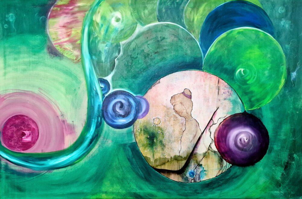 „Atmende Dame“ zeigt eine Welt, die sich gerade neu sortiert, nicht laut, sondern wie unter Wasser. Die schwebenden Kreise erinnern an überfüllte ökologische, soziale und digitale Systeme, die sich unaufhörlich drehen. Die zentrale Figur ist kaum definiert, als würde sie sich aus den Strukturen der Gegenwart erst herauslösen wollen, wie ein Bewusstsein, das zwischen Anpassung und Aufbruch hängt. Sie atmet nicht einfach, sie stemmt sich gegen den Druck der Zeit. Ein visuelles Atemholen, leise, aber enorm widerständig.