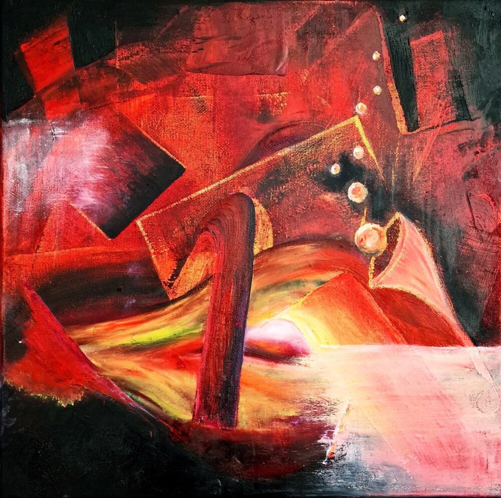 Eine dominante Rotpalette durchzieht die Fläche und erzeugt Hitze, Reibung und innere Spannung. Die Oberfläche ist fragmentiert, ohne zur Ruhe zu kommen. Nichts wirkt abgeschlossen, alles scheint im Prozess.