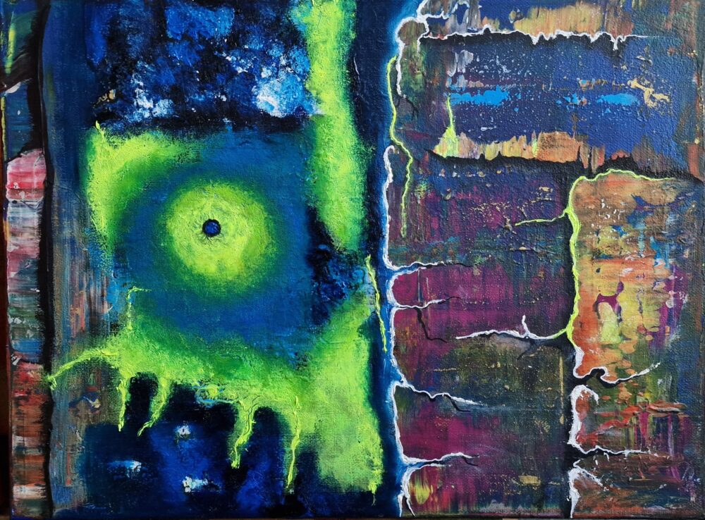 Spannung als Zustand unserer Gegenwart. Zwei Bildräume stehen einander gegenüber: links ein leuchtendes Zentrum, das sich aus Blau- und Grüntönen heraus formt, rechts eine verdichtete Zone aus Schichten, Brüchen und Spuren. Dazwischen verläuft eine gebrochene Linie, wie eine Naht, eine Grenze oder eine fragile Verbindung.